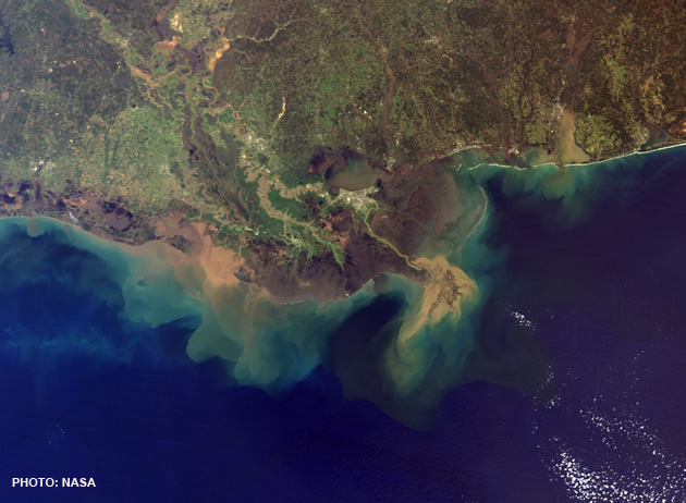 The hottest hotspot of land-based impact on marine ecosystems is the Mississippi River. The river plume is shown here as seen from space.