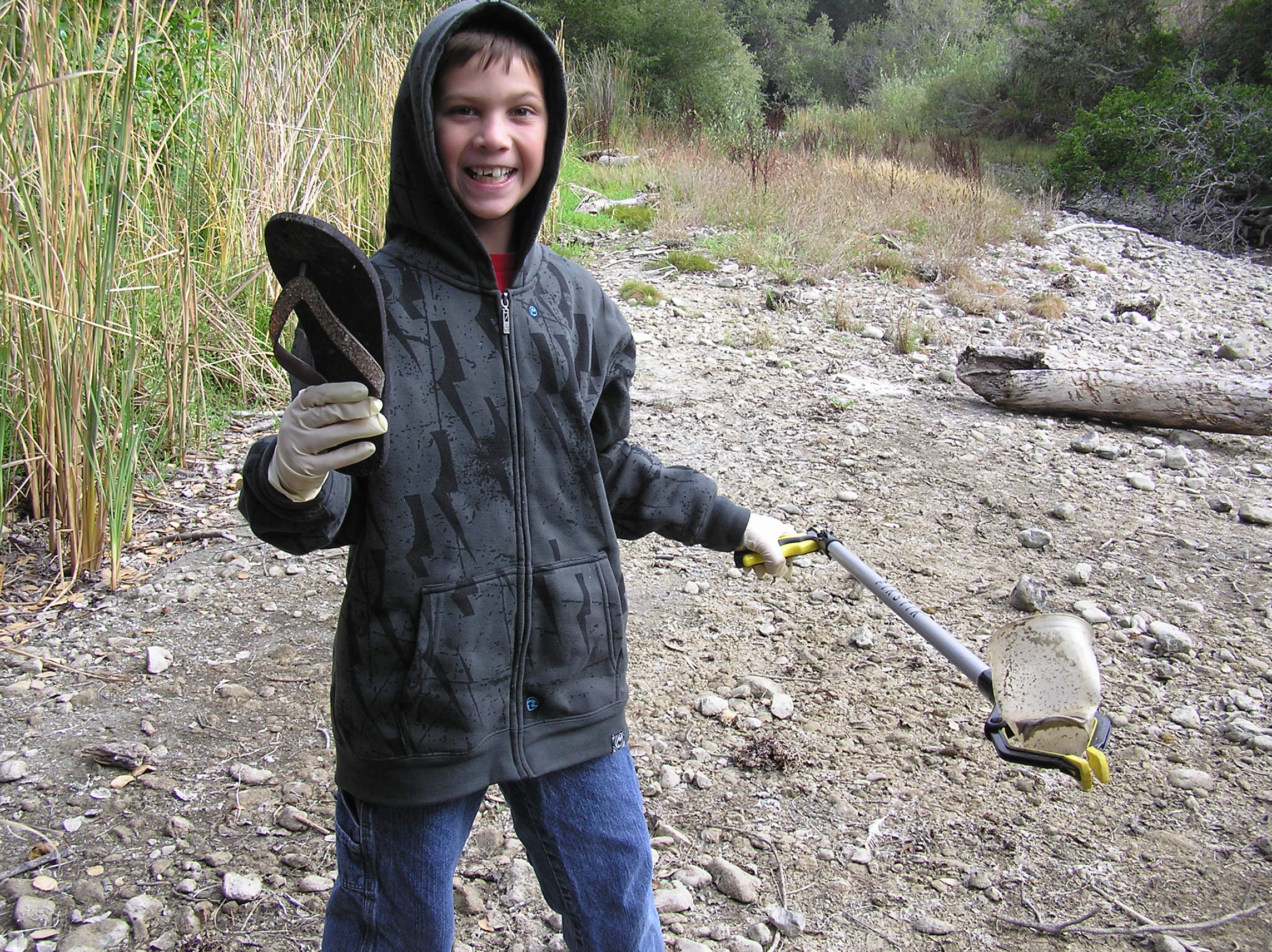 Cambria. Ryan’s finds included a necklace, which if once washed into the sea, would eventually break down into bite-sized plastic beads resembling fish eggs to hungry fish. Besides tiny bits of broken plastic, bottle caps and food wrappers we also added one plastic flip flop to the trash bag.