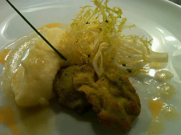 (Photo by Chef Dakota Weiss, Hotel Shangri-la, Santa Monica: Sustainable herbed abalone, argan pommes puree, salted vanilla vinaigrette.)