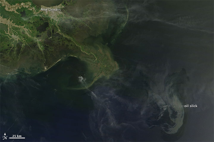 The continuing enviro-disaster from the exploded and destroyed oil rig Deepwater Horizon, considered “one of the safest and most advanced offshore drilling rigs in the world,” in the Gulf of Mexico is about to make landfall. That is, the 200,000 +/- gallons of oil spewing into the fragile Gulf of Mexico waters of will begin oozing into the delicate wetlands and estuaries of Louisiana tomorrow, Friday, April 30. The coasts of Mississippi and Alabama begins battling oil-coated shores by Sunday.