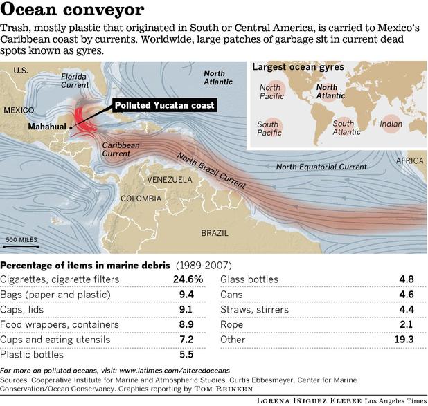 The peninsula happens to sit along the path of regional currents that act like an aquatic conveyor, carrying a steady stream of plastic garbage from the Caribbean and Central and South America. Much of the flotsam washes ashore in and around Mahahual, a small but growing beach town about 40 miles north of the Belize border.
