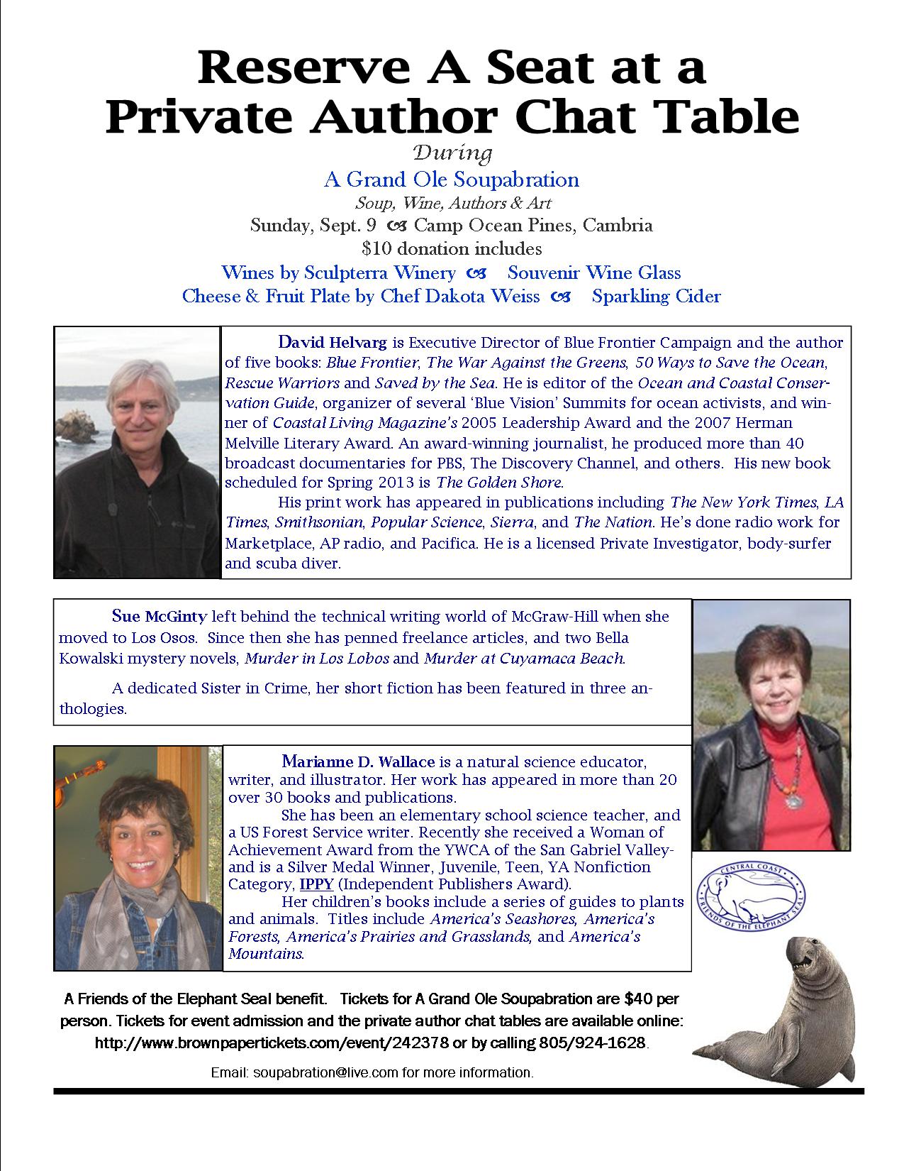 You will want to meet one of our featured authors, David Helvarg, while you taste soup from nine Central Coast restaurants & chefs, sip local wines and inhale the magnificent view from the bluffs of Camp Ocean Pines. This is a zero waste event.