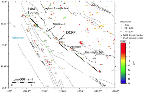 And that’s the subject of this blog—an inconvenient truth that highlights the assumed wisdom of the construction of a nuclear power plant (Diablo Canyon Power Plant) along the Pacific west coast just outside of San Luis Obispo, CA, commissioned in 1985. The Hosgri fault lies about three miles offshore from the nuclear powered plant. The San Andreas fault keeps rocking just 45 miles east of the plant. The Hosgri fault churned up a 7.1 earthquake in 1927. But a recent discovery of another fault line The Shoreline Fault (shown in the adjoining illustration), really rattled geologists, engineers and the community, as a whole, regarding the overall safety of “El Diablo,” as some activists refer to the power plant.