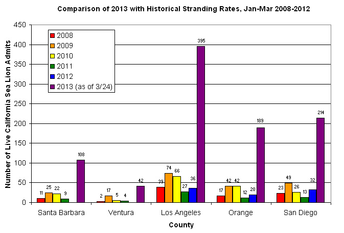 Beginning in January 2013, elevated strandings of California sea lion pups have been observed in Southern California (Santa Barbara, Ventura, Los Angeles, Orange, and San Diego Counties). The area with the highest reported stranding rates is currently Los Angeles County, followed by Orange County, and strandings are increasing in San Diego County.