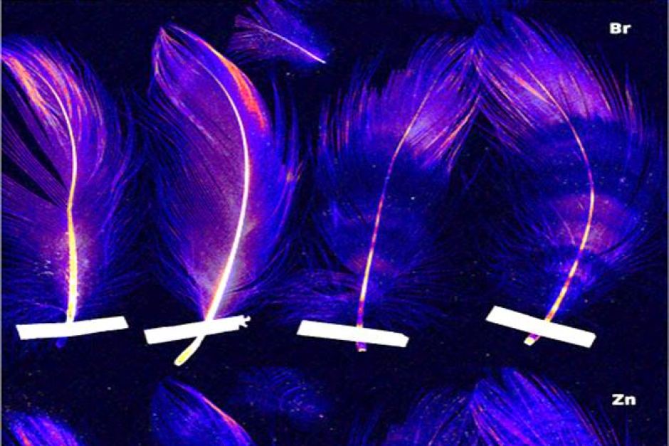 PHOTO: Bird feathers in the Synchrotron in Melbourne, which measures chemical composition of plastic samples. (Supplied: ANSTO)
