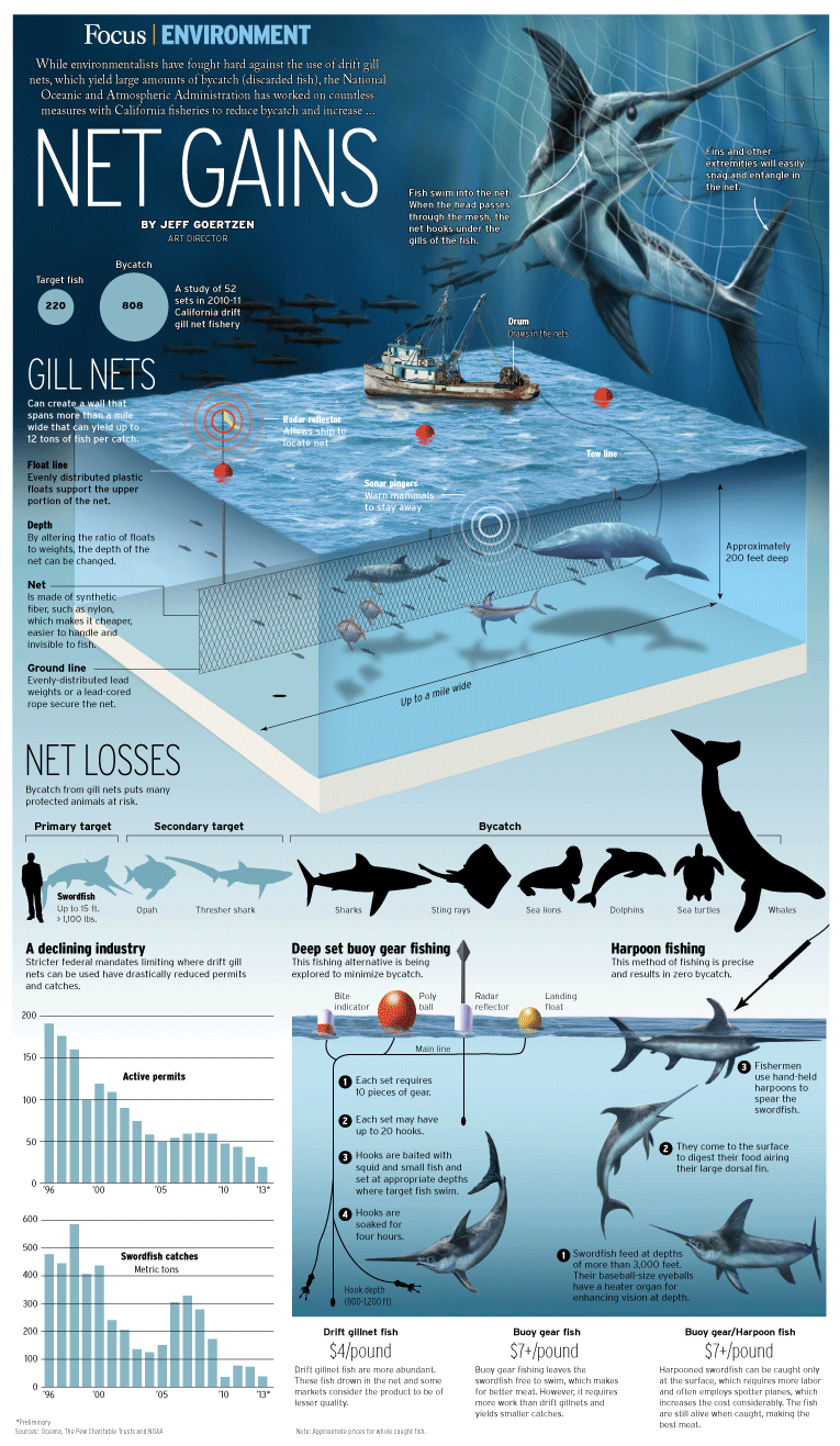 A handful of fishermen from Southern California lay out drift gillnets like open ocean blankets, an attempt to capture tasty and profitable swordfish and, in the process, make a living.