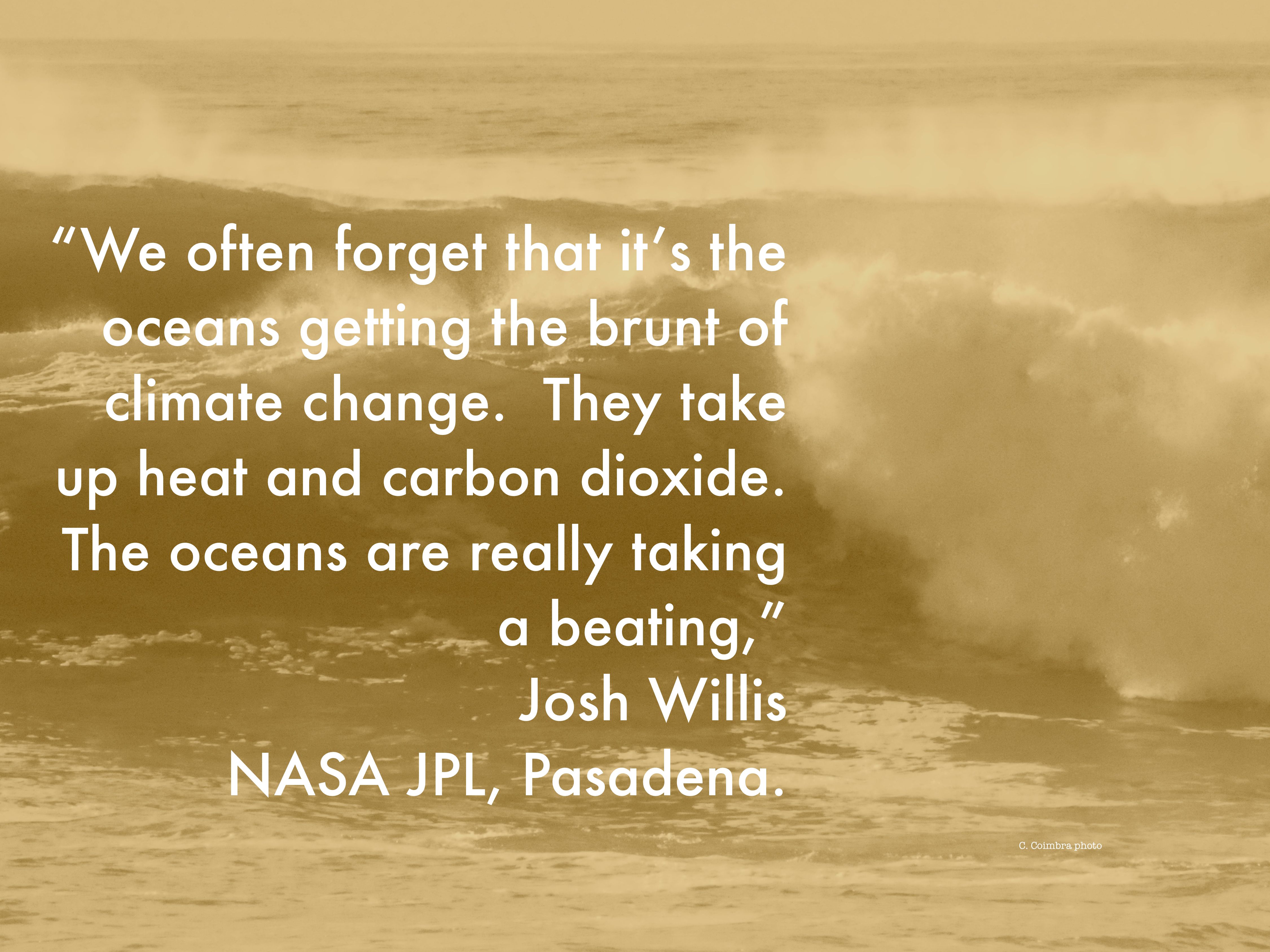 Oceanographer and climate scientist Josh Willis of NASA’s Jet Propulsion Laboratory in Pasadena told me, “We often forget that it’s the oceans getting the brunt of climate change. They take up heat and carbon dioxide. The oceans are really taking a beating.”