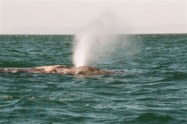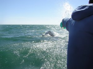“Let’s see what we can find out there now,” Jesus said, as he and the other panga captains took us back to the nursery. Our captain took a different route. Now the water was choppy and windblown. Dolphins signaled our closeness to the whales. The captain silenced his outboard and began scooping and tossing water into the distance.